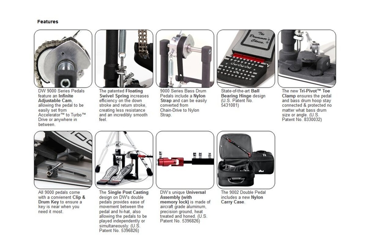 DW 9000, to flagowa seria pedałów bębna basowego firmy DW. Cechują je materiały najwyższej jakości, bardzo precyzyjne wykonanie i mnogość regulacji, dzięki czemu każdy perkusista znajdzie komfortowe dla siebie ustawienie.