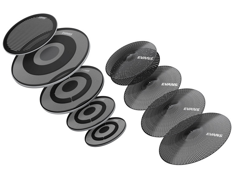 Evans dB One Mesh Rock Pack + Cymbals - zestaw cichych talerzy i naciągów siateczkowych o unikalnej konstrukcji, przeznaczonych do tomów, werbla i bębna basowego.