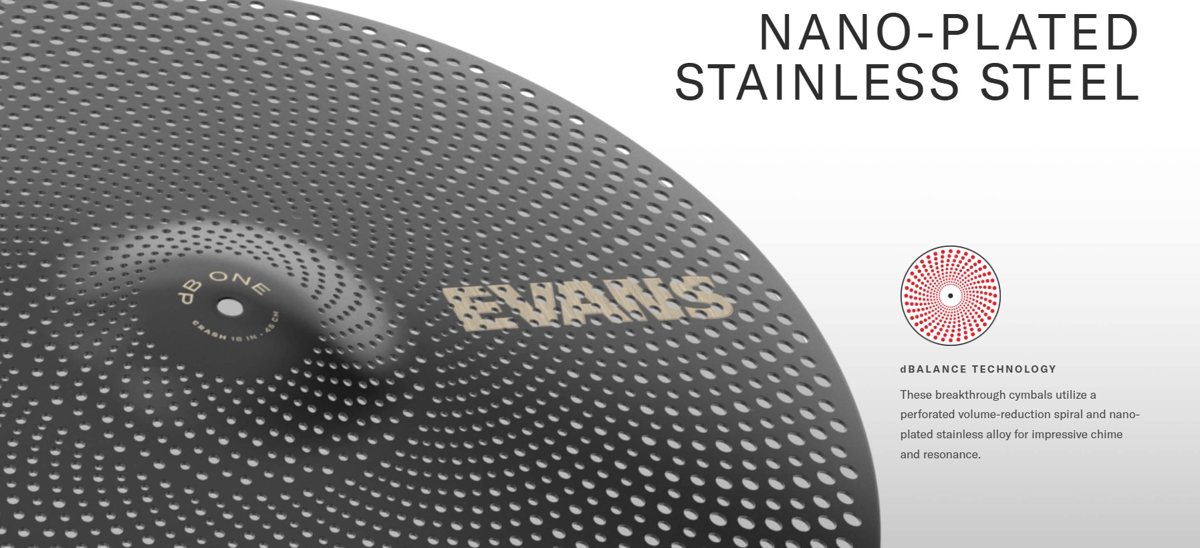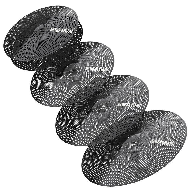 Evans dB One Cymbal Pack to zestaw talerzy do ćwiczenia i cichego grania. Spiralnie perforowana konstrukcja talerzy pozwala obniżyć głośność o około 80% w stosunku do tradycyjnych talerzy. Talerze Evans dB One zapewniają odczucia z gry takie same jak w przypadku normalnych talerzy.