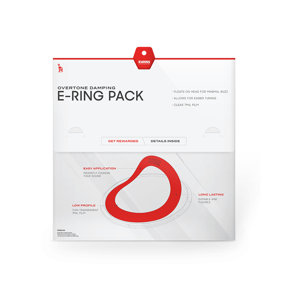 Evans E-Ring to pierścień tłumiący wykonany z przezroczystego mylaru. Wycina wysokie harmoniczne i skraca wybrzmienie. Łatwy w obsłudze - wystarczy położyć go na naciągu uderzanym.