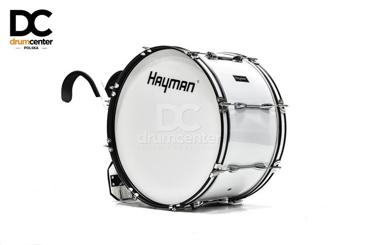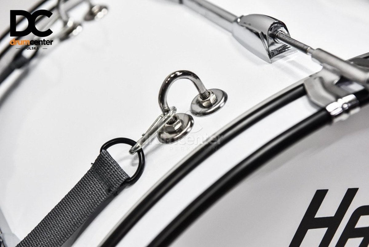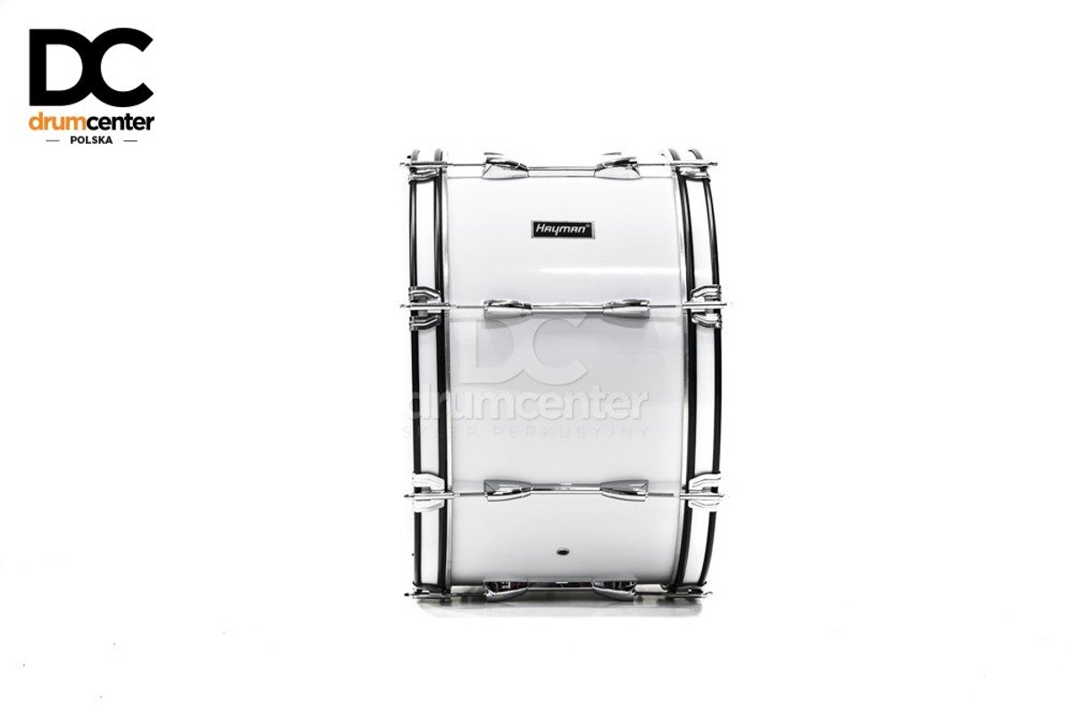 Basowy bęben marszowy Hayman zbudowany jest z drewna pokrytego białym kolorem z zewnątrz.