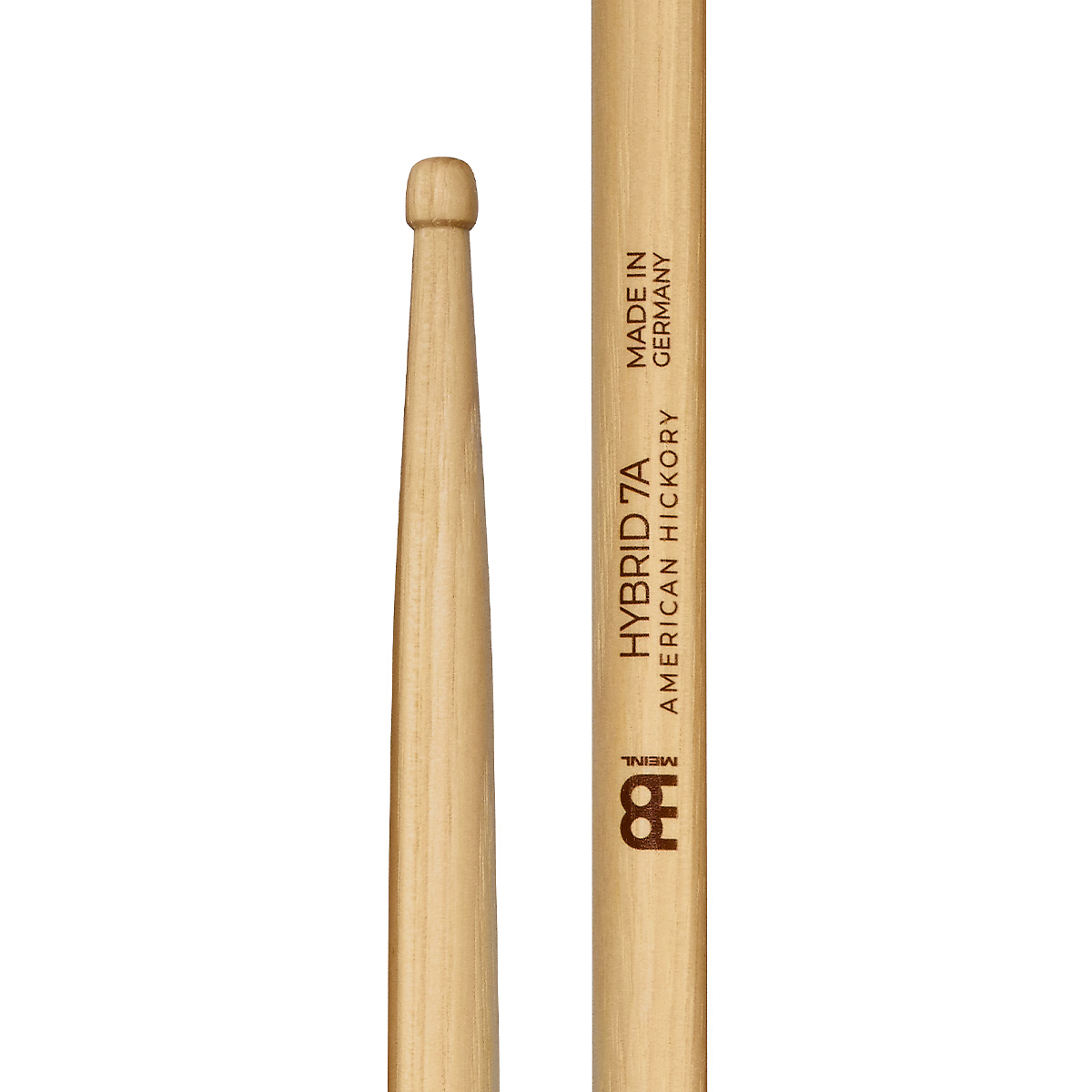 Meinl 7A Hybrid Hickory - jeden z najcieńszych standardowych modeli w wersji Hybrid wykonany z amerykańskiej hickory. Doskonałe do jazzu i gry w niewielkich, akustycznych składach, choć posiadają duże grono entuzjastów poruszających się w wielu innych gatunkach muzycznych. Znakomicie wyważone, zakończone drewnianą główką w kształcie zmodyfikowanej baryłki (Hybrid Tip). Model 7A Hybrid jest przedłużony o 0.25" (7 mm dłuższe niż standardowy model 7A).