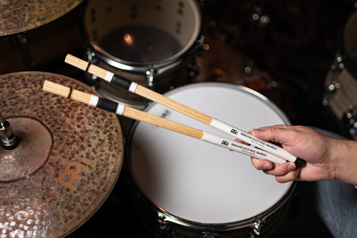 Meinl Bamboo Rebound - rózgi wykonane z 11 pręcików bambusowych wzmocnionych owijką dla większej sztywności i żywotności. Pręciki otaczają piankowy rdzeń co skutkuje lepszym odbiciem na tomach i werblu oraz jeszcze lżejszym atakiem na talerzach.