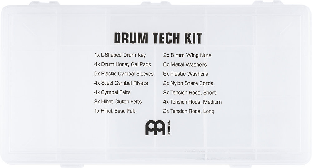 Meinl Drum Tech Kit - zestaw naprawczy, tak zwany niezbędnik perkusisty zawierający najpotrzebniejsze części zamienne. Starannie przygotowany zestaw, który wspomoże Cię w sytuacjach awaryjnych na trasie czy podczas prób. Ile razy szukałeś śrub po koncercie, zgubiłeś motylek, filc czy szukałeś sznurków do sprężyn? Gotowy zestaw od Meinla pozwala spać spokojnie nie martwiąc się o przykre niespodzianki.