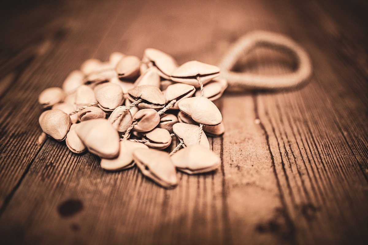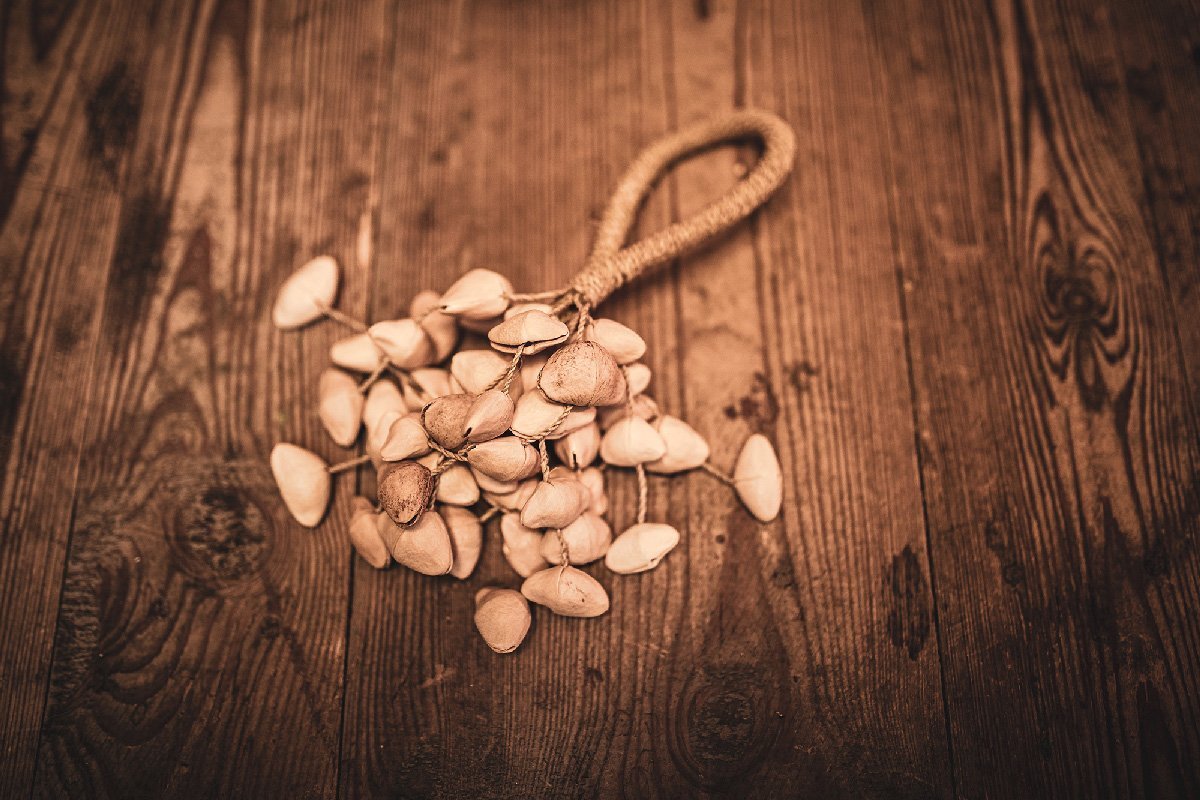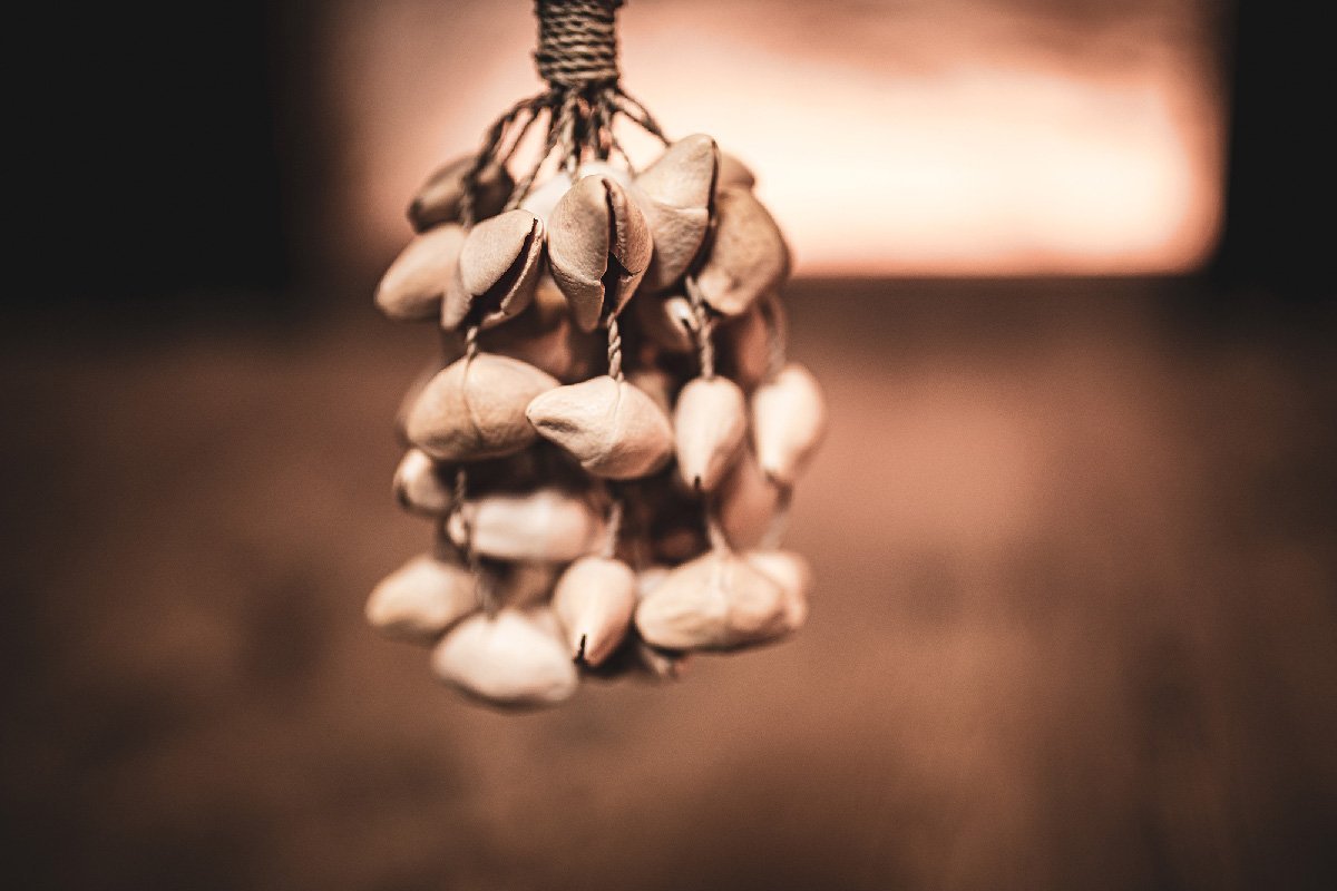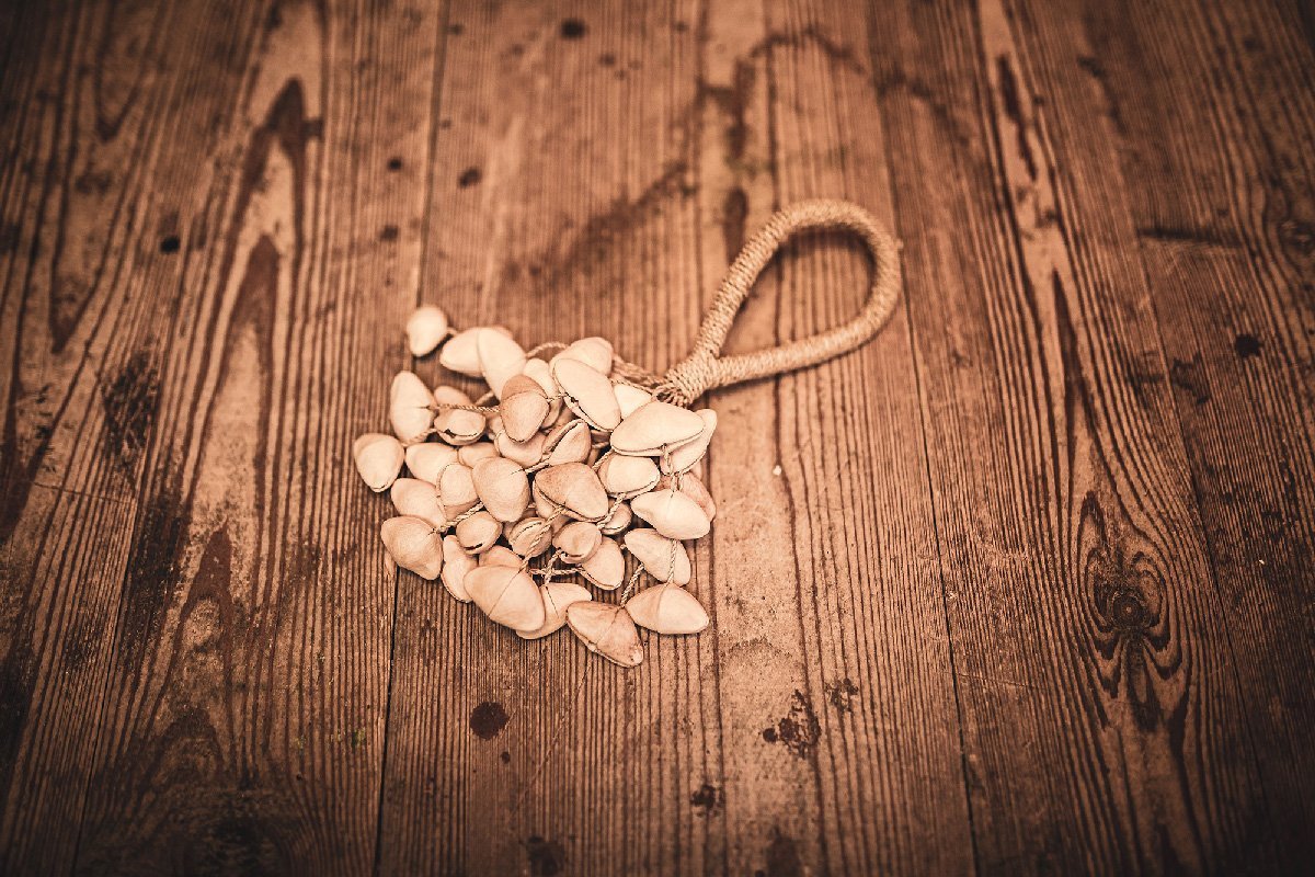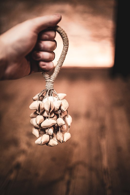 Łuski orzechów Kenari, przymocowane do paska na nadgarstek, tworzą wyjątkowy, wszechstronny instrument.