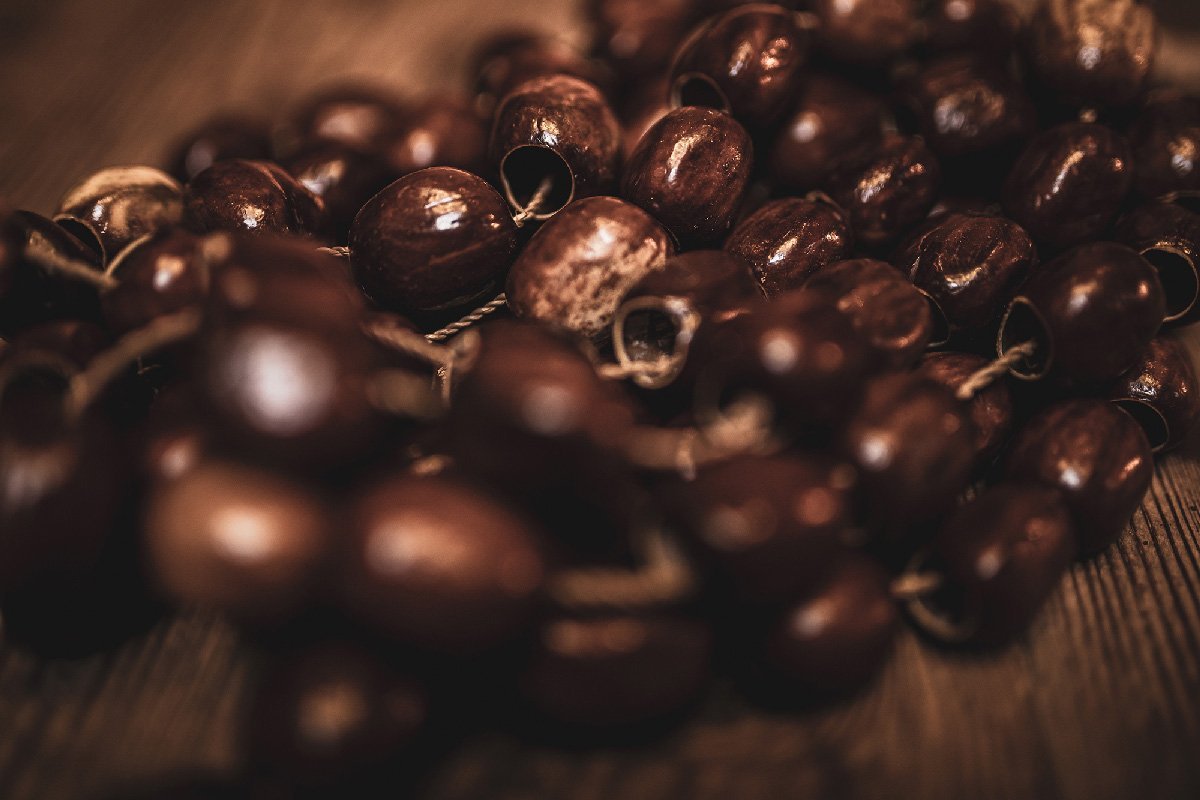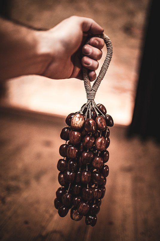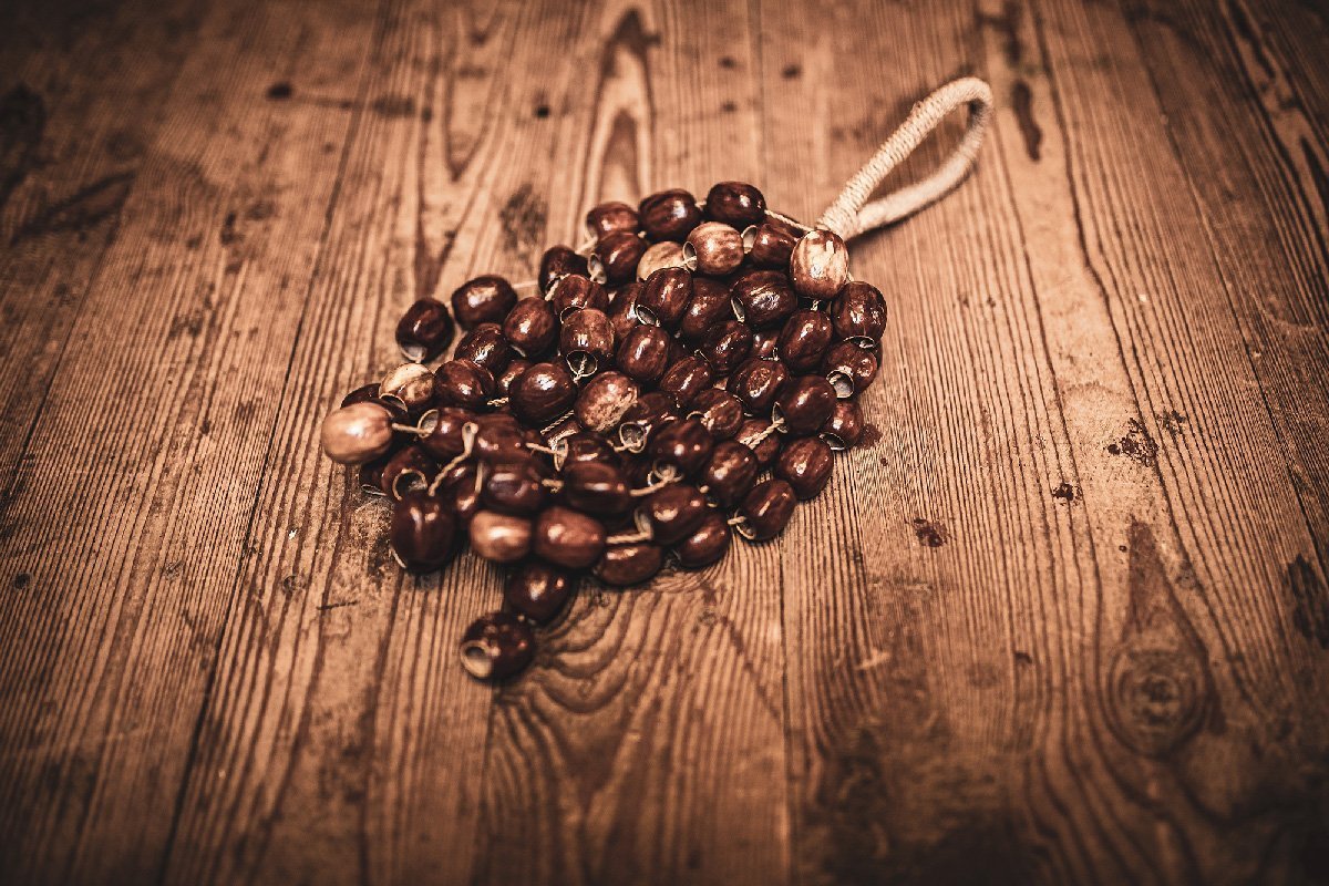 Łuski orzechów Pala przymocowane do paska na nadgarstek tworzą wyjątkowy, wszechstronny instrument.