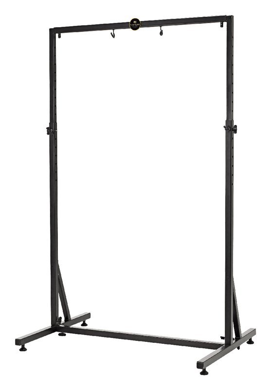 Bardzo stabilny ramowy stojak na gong. Pomieści gong o maksymalnej średnicy 40" (100 cm). Dzięki ramowej konstrukcji i czterem nogom jest bardzo stabilny, nawet przy stosowaniu dużych gongów o dużych wibracjach. Statyw nie hamuje wibracji gongu, posiada haczyki do zawieszenia oraz regulację wysokości co 5 cm. Idealny do dużych i ciężkich gongów.