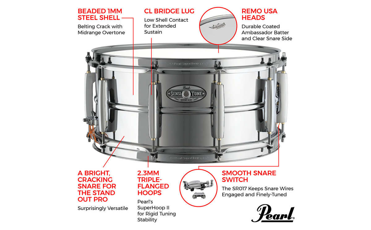 Pearl SensiTone Heritage Steel 14x6,5 STH1465S - klasyczny werbel stalowy z zawodowej serii SensiTone, która od 25 lat jest wyznacznikiem profesjonalnego brzmienia w atrakcyjnej cenie. Stalowy korpus o grubości 1mm zapewnia wyśmienity atak, czułość i mocne brzmienie pożądane przez rockowych bębniarzy. Werble z serii SensiTone wyśmienicie sprawdzają się w warunkach koncertowych jak i w studio nagraniowym.