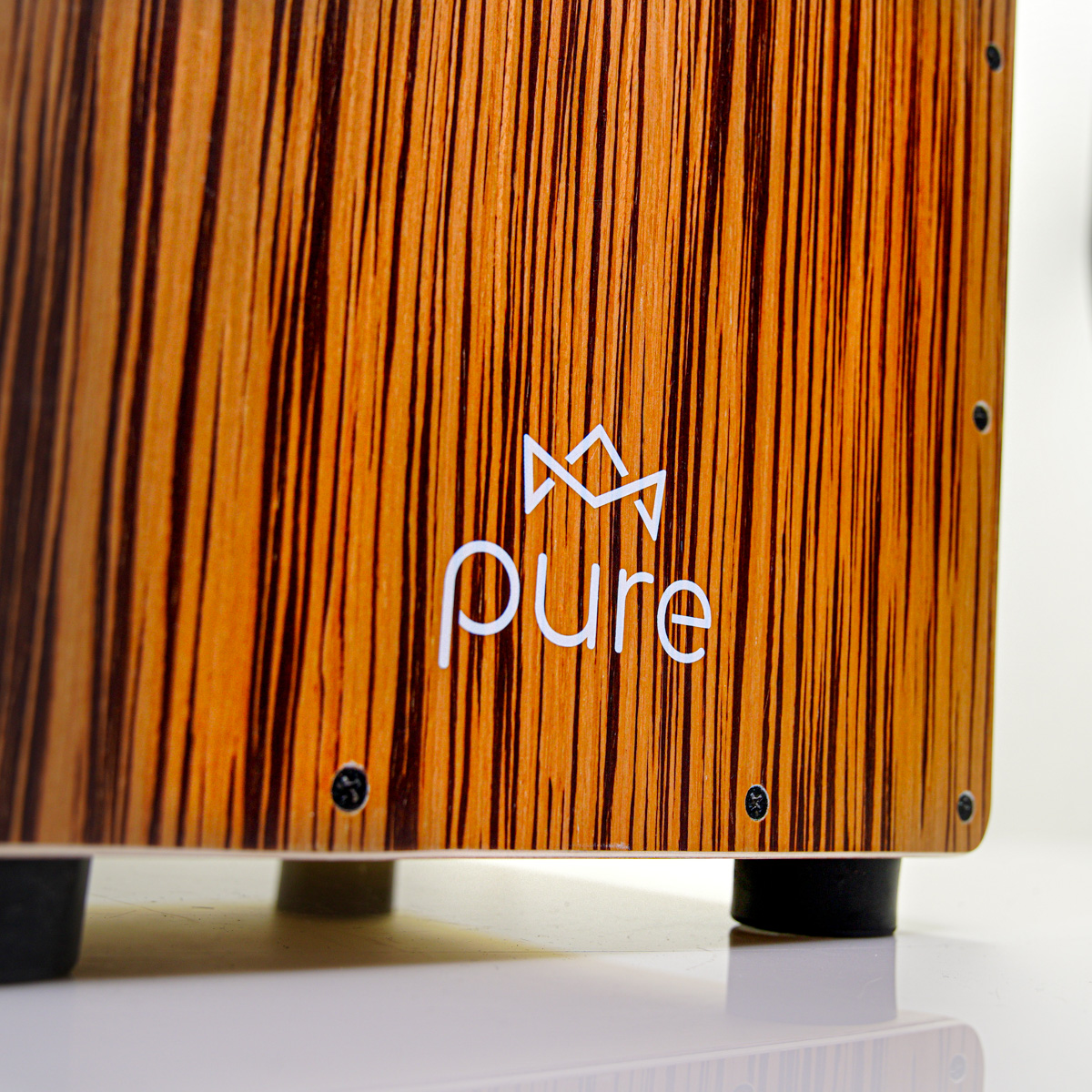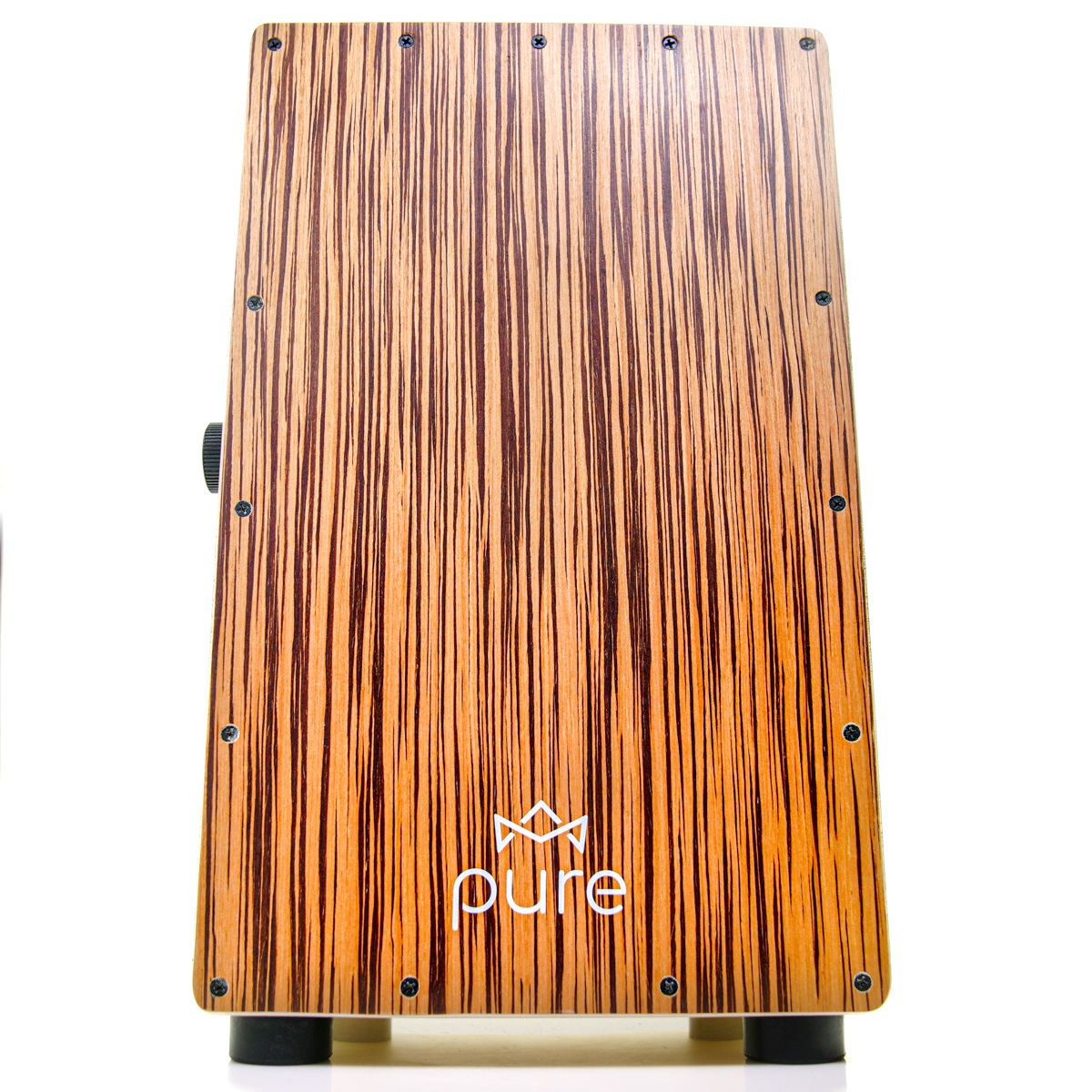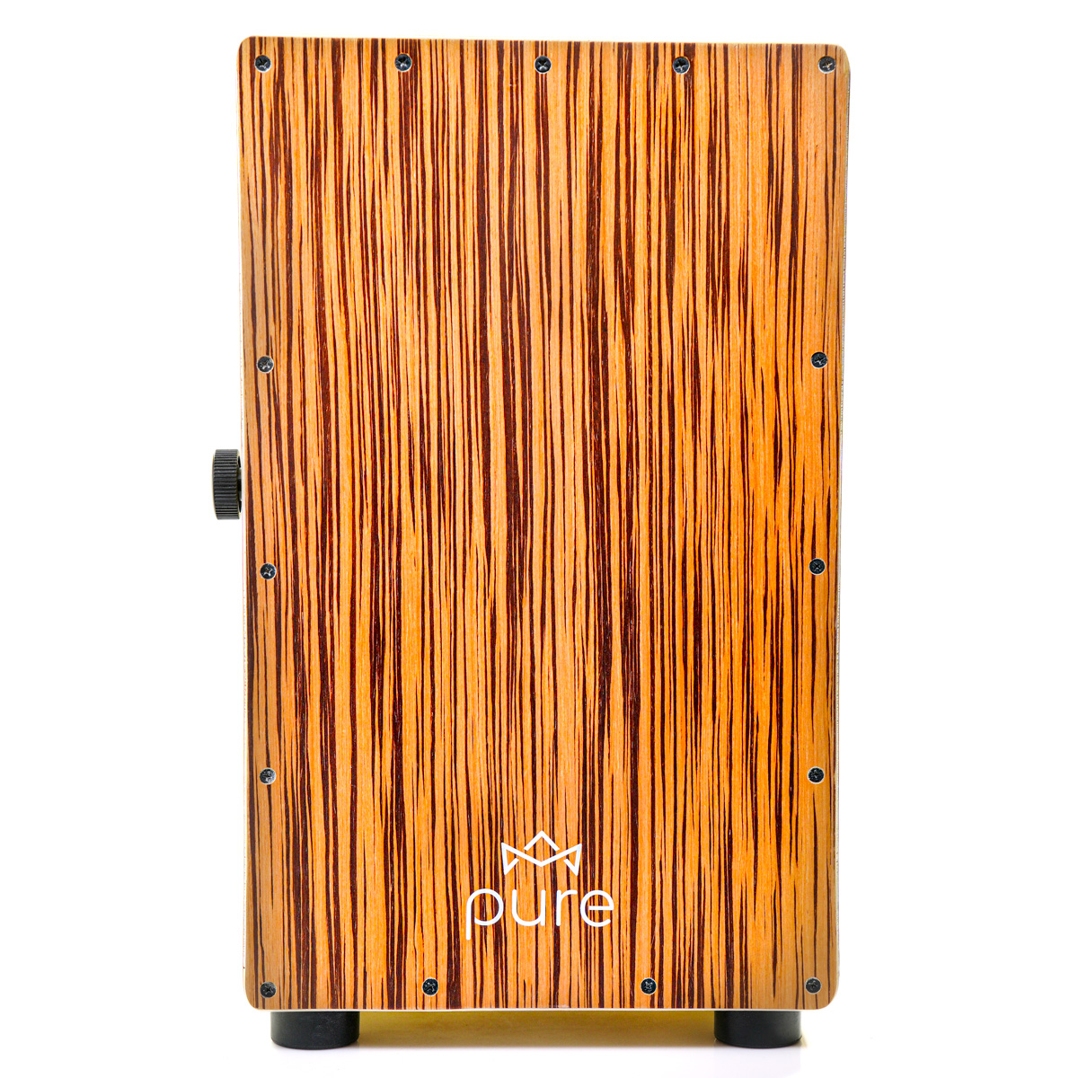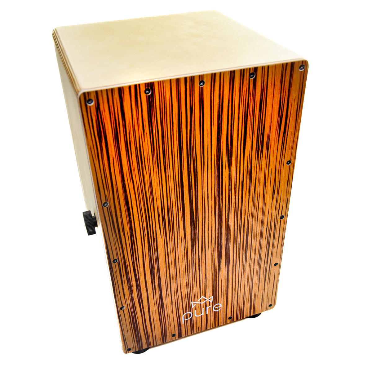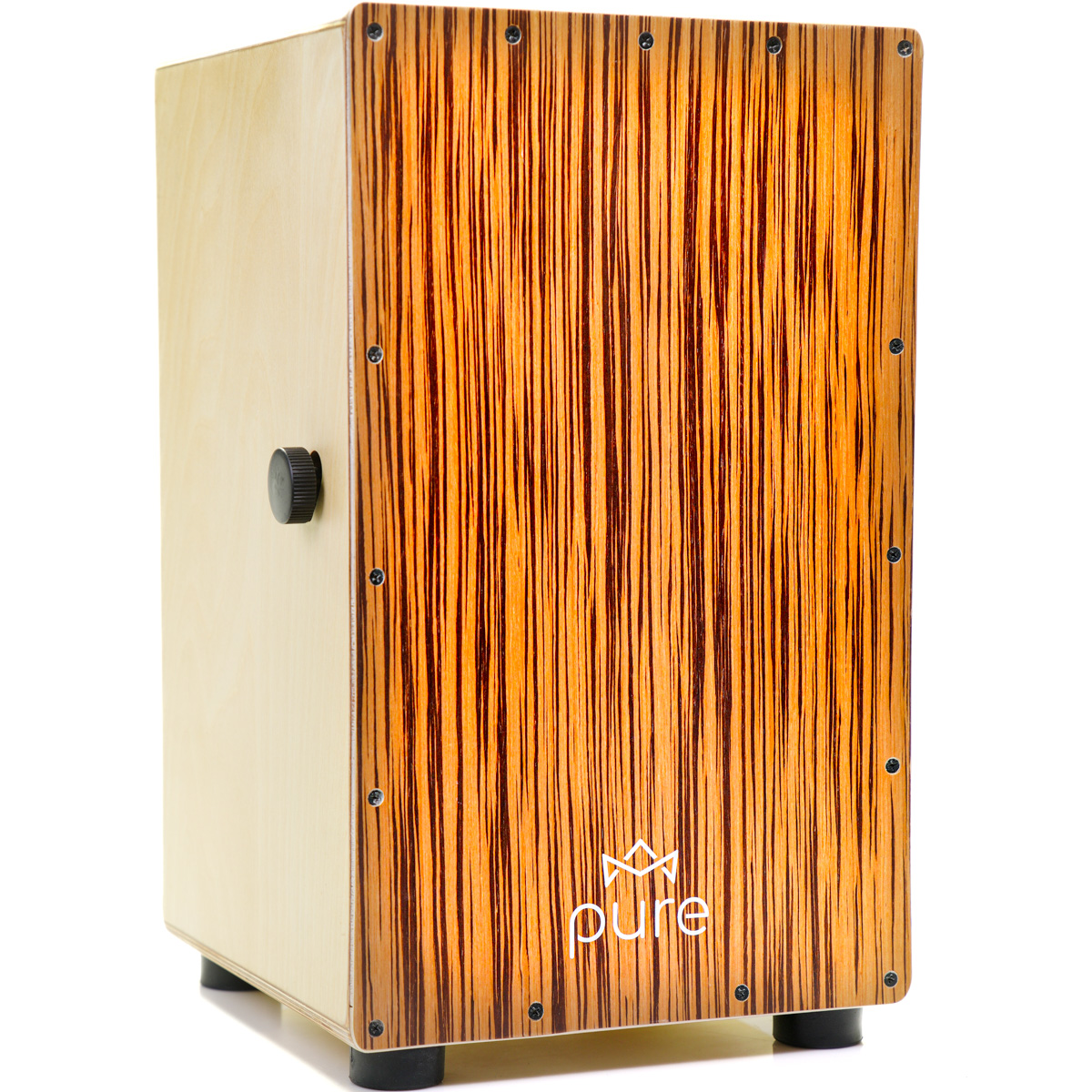 Cajon marki PURE z serii Pro Exotic to pełnowymiarowy instrument, którego korpus wykonany jest z drewna brzozowego. Pasuje on do wszystkich popularnych pokrowców na cajona. Front cajona wykonany w wersji BM ZEBRAWOOD. Bardzo ważą cechą cajonów z tej serii jest możliwość regulacji siły docisku sprężyn do płyty czołowwej lub ich całkowite wyłączenie. Mechanizm opiera się na przesuwanym po księżycowej prowadnicy pokrętle zaciskowym co uniemożliwia samoistne poluzowanie się sprężyn.