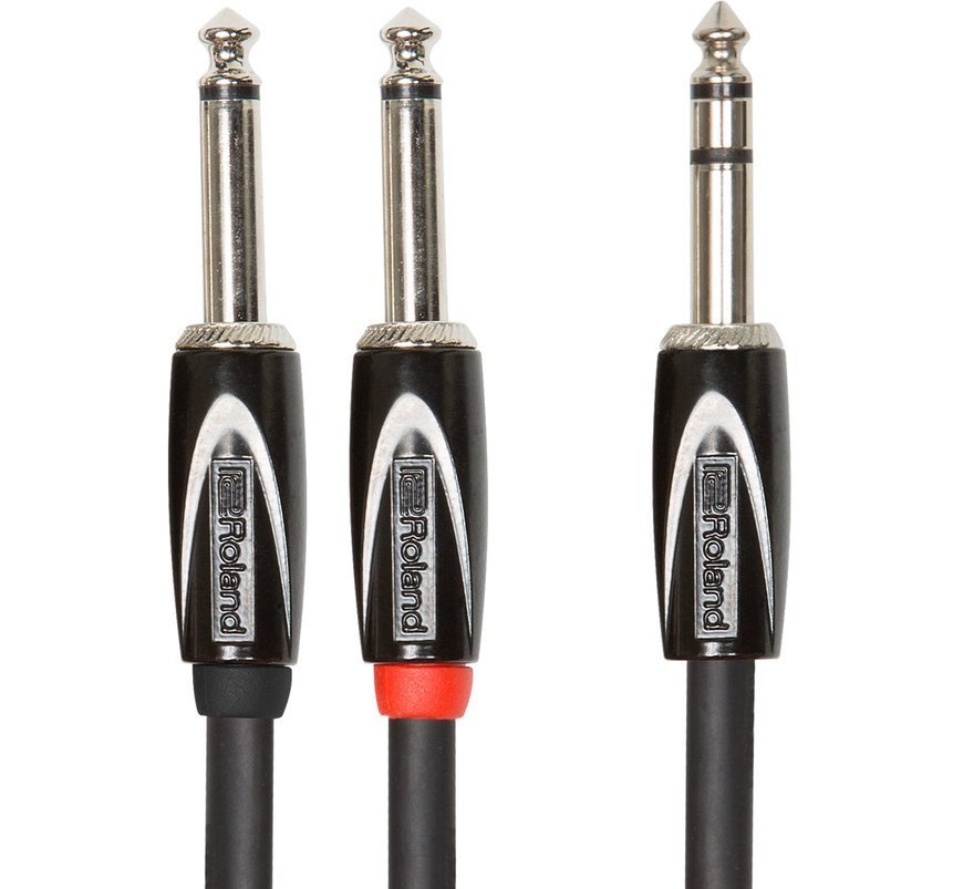Roland Black Series Kabel RCC10TR28V2 - wysokiej jakości kabel sygnałowy typu Y. Po jednej stronie dwa wtyki mono Jack 6,3 mm, a po drugiej stereo Jack 6,3 mm.