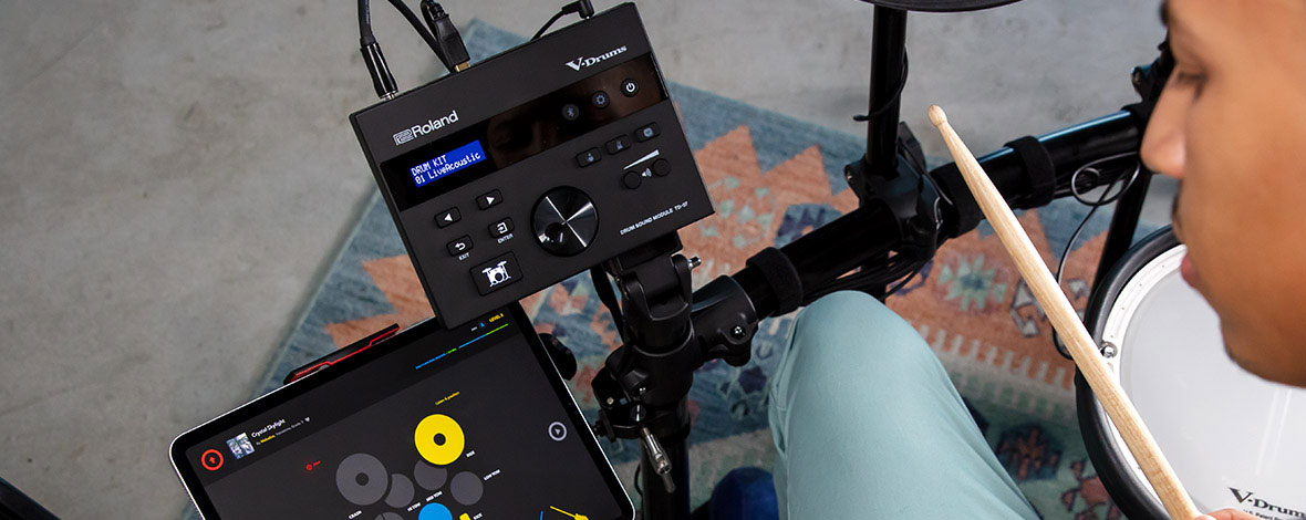 Dzięki wbudowanemu Bluetooth możesz przesyłać utwory z telefonu czy komputera wprost do modułu i słyszeć je równolegle z dźwiękami perkusji. Przesyłany jest również dźwięk wideo, idealny do grania wraz z utworami online i treściami lekcji. A jeśli nie masz urządzenia Bluetooth, możesz podłączyć dźwięk stereo za pomocą kabla. Obsługiwana jest również transmisja MIDI przez Bluetooth, co umożliwia bezprzewodowe nagrywanie danych MIDI w aplikacjach muzycznych.