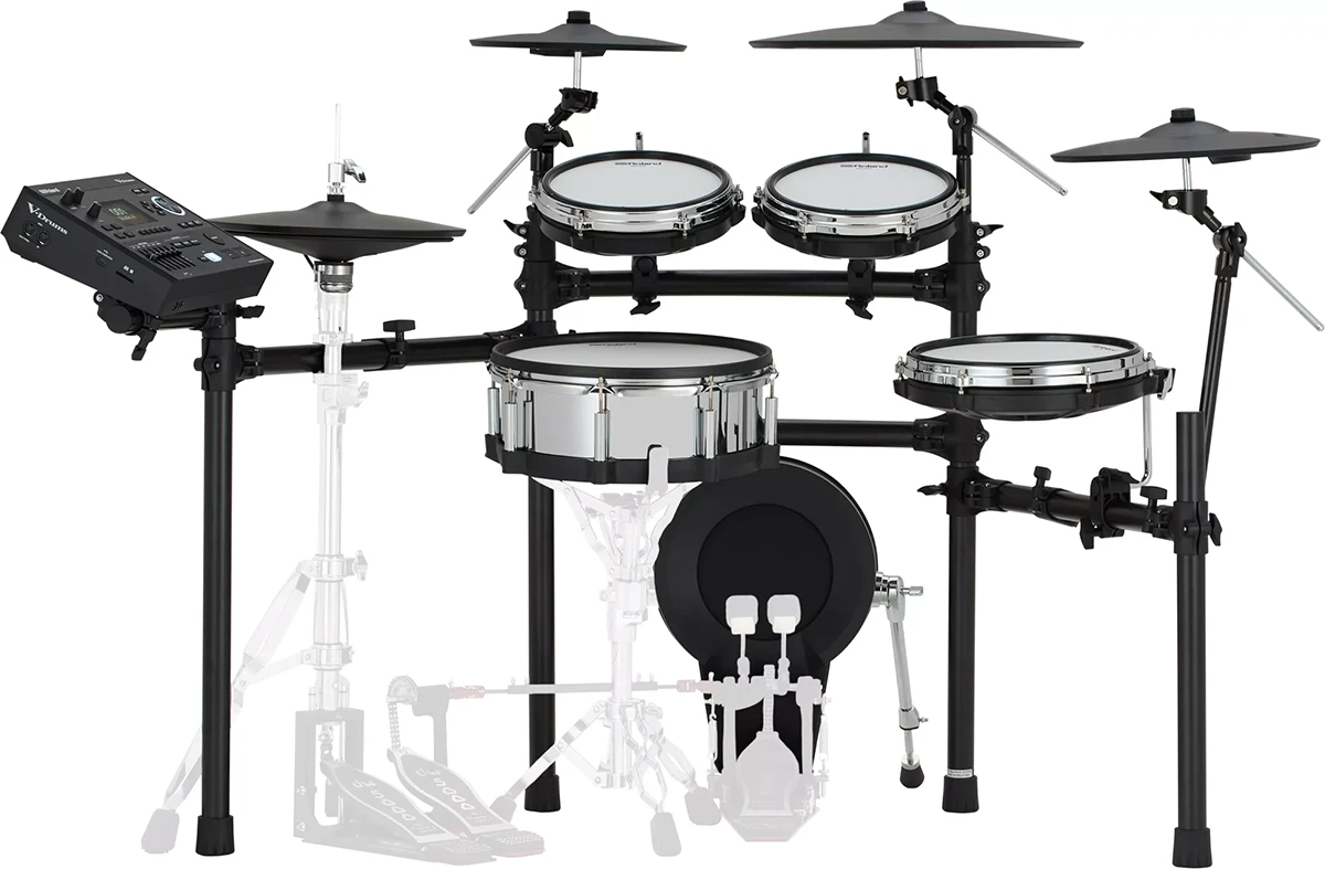 - Hi-hat: VH-14D – cyfrowy hi-hat na klasycznym statywie, z dokładną detekcją otwarcia/zamknięcia i wyciszaniem dotykowym