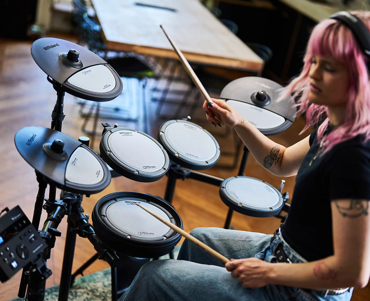 - Moduł: Roland TD-07 (25 presetów, edycja brzmień, Bluetooth audio/MIDI, USB audio/MIDI, metronom, coach, nagrywanie, import przez USB)