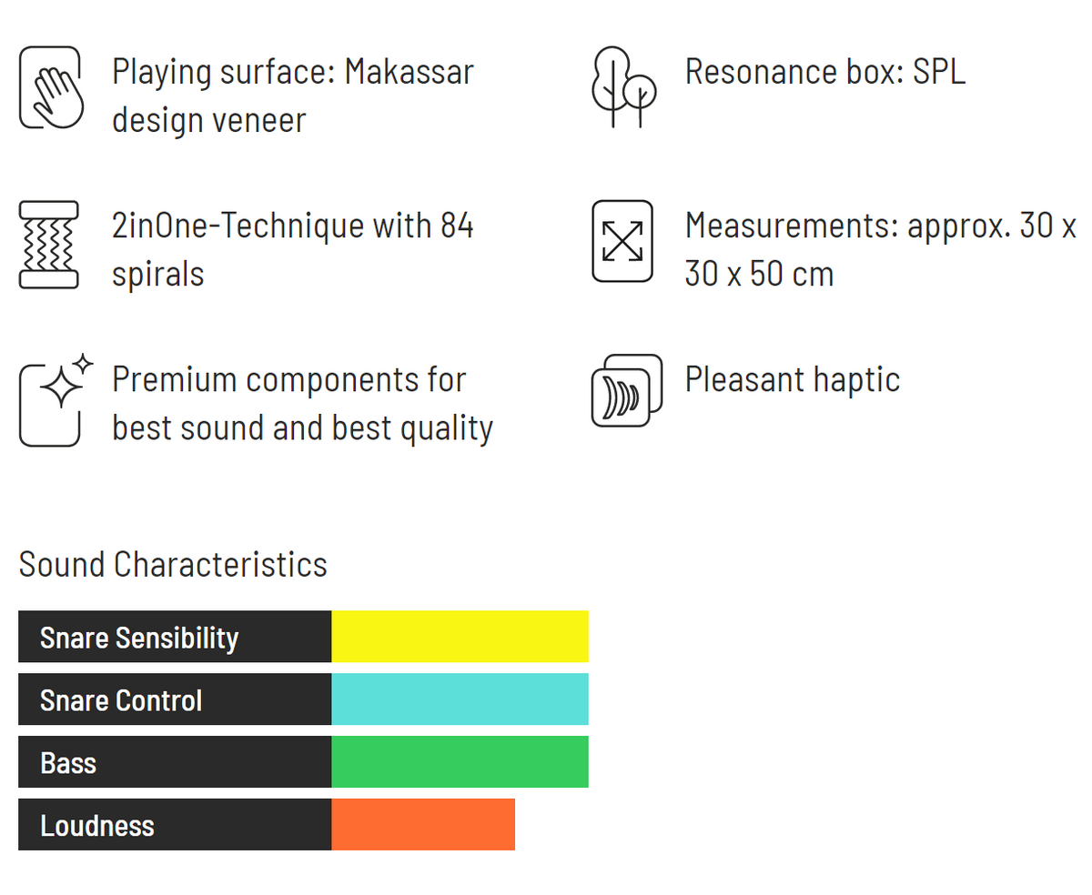 W pełni profesjonalny, a w naszej opinii, jeden z najpiękniej się prezentujących cajonów Schlagwerk. CP432 2inOne "deluxe" Makassar został zaprojektowany w taki sposób by oferować jak największą ilość niski rejestrów, ale również dzięki aż 84 (!!!) strunom sprężyn bogato wyeksponowane górne pasmo. Przepiękny zawodowy instrument.