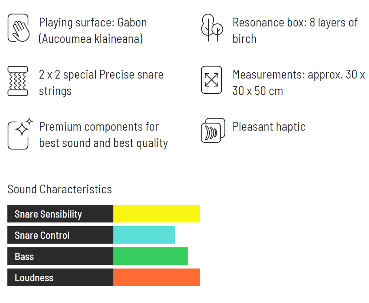 Podczas projektowania uwzględniono kluczowe punkty drgań, by najlepiej rozmieścić śruby. To rozwiązanie przełożyło się na bardzo otwarty dźwięk podstawowy instrumentu i silny bas. Cztery struny z regulacją napięcia pozwalają na uzyskanie optymalnego dla nas brzmienia i czułości.