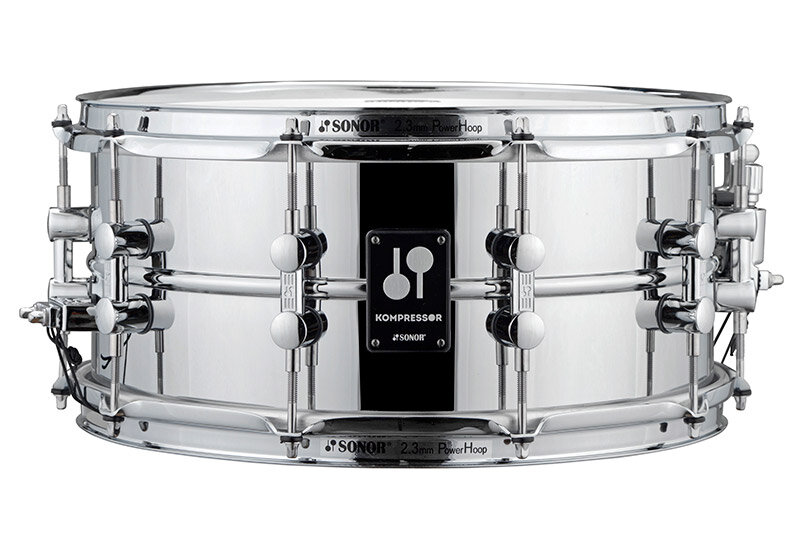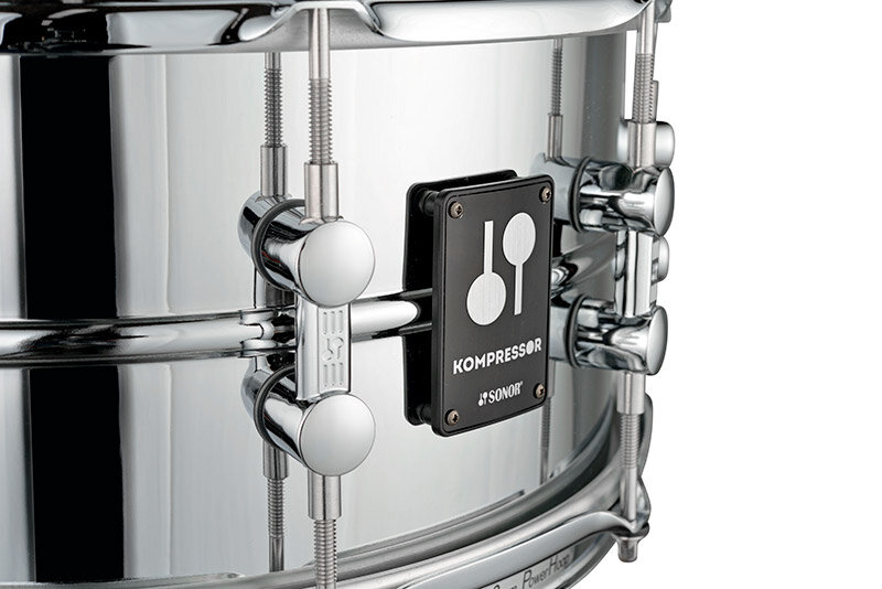 Wszystkie werble z rodziny Sonor Kompressor wyposażone zostały w obręcze stalowe 2,3 mm Power Hoops co daje gwarancję łatwego stroju, dobrego ataku i selektywnego rimcklika.