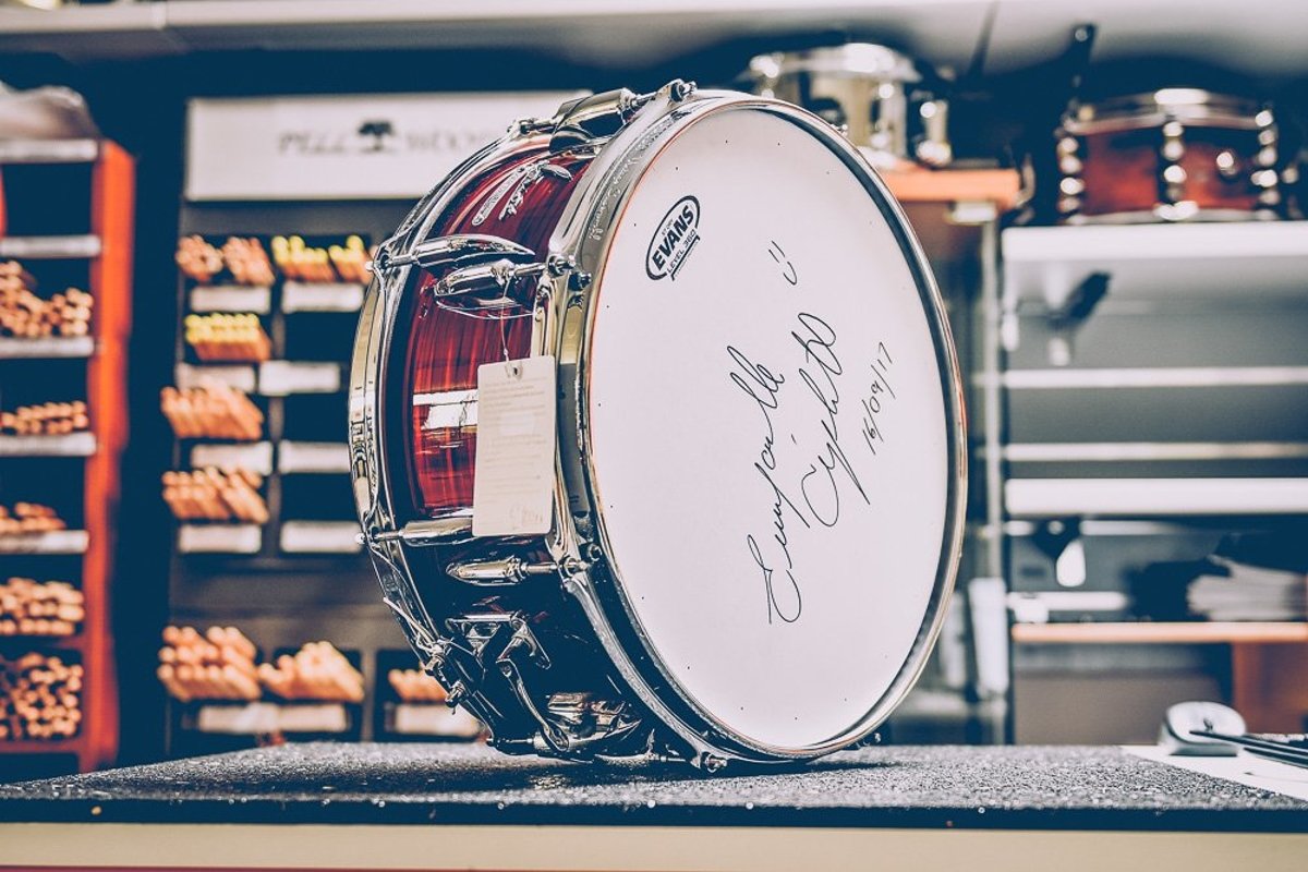 Werbel z podpisem Emmanuelle Caplette na naciągu. Werbel na którym grała artystka na klinice w Polsce.