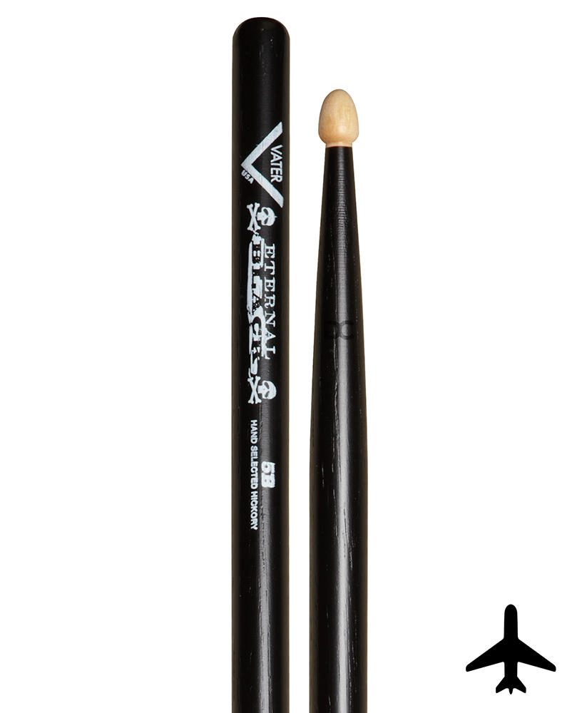 Vater Eternal Black 5B VHEB5BW to hickorowe pałeczki perkusyjne w popularnym rozmiarze 5B ]wykończone czarnym lakierem.