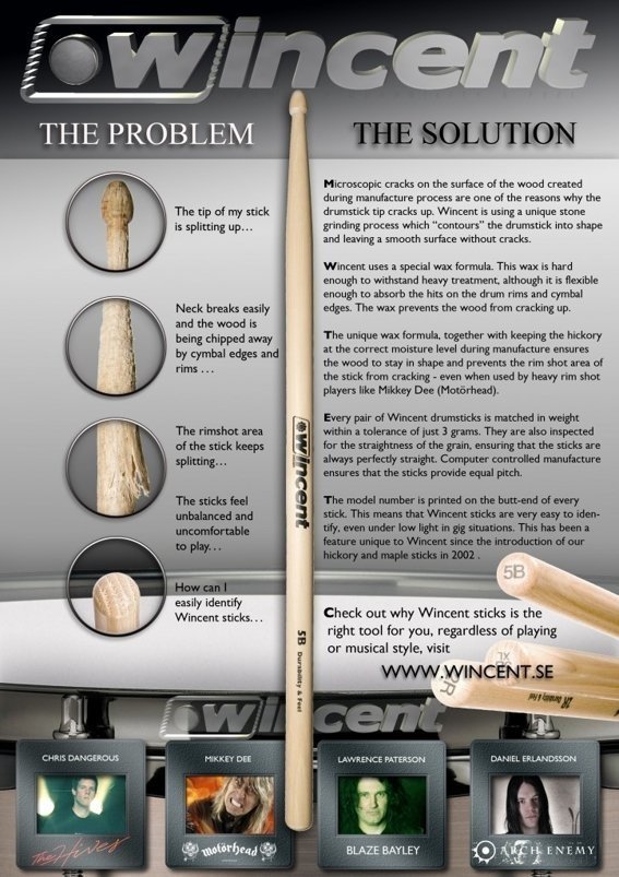 Wincent to szwedzki producent pałek znany z wysokiej jakości i dużej wytrzymałości swoich produktów. Innowacyjne techniki produkcji, wykończenia i selekcjonowania drewna pod względem wagi i usłojenia pozwoliły stworzyć pałki o dużej żywotności oraz doskonałym komforcie gry.Każdy model pałek Wincent posiada nadrukowane oznaczenie od strony rękojeści co ułatwia identyfikację nawet w słabym oświetleniu scenicznym.