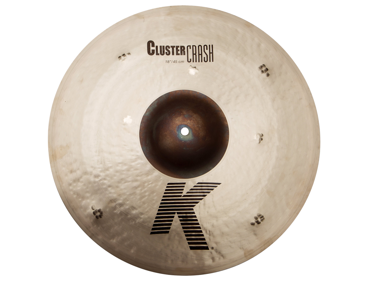 Zildjian K Cluster Crash 18 - bardzo cienki crash o ciemnym i trashowym brzmieniu. Swoje brzmienie zawdzięcza niskiej wadze oraz głębszemu młotkowaniu w kilku punktach talerza.